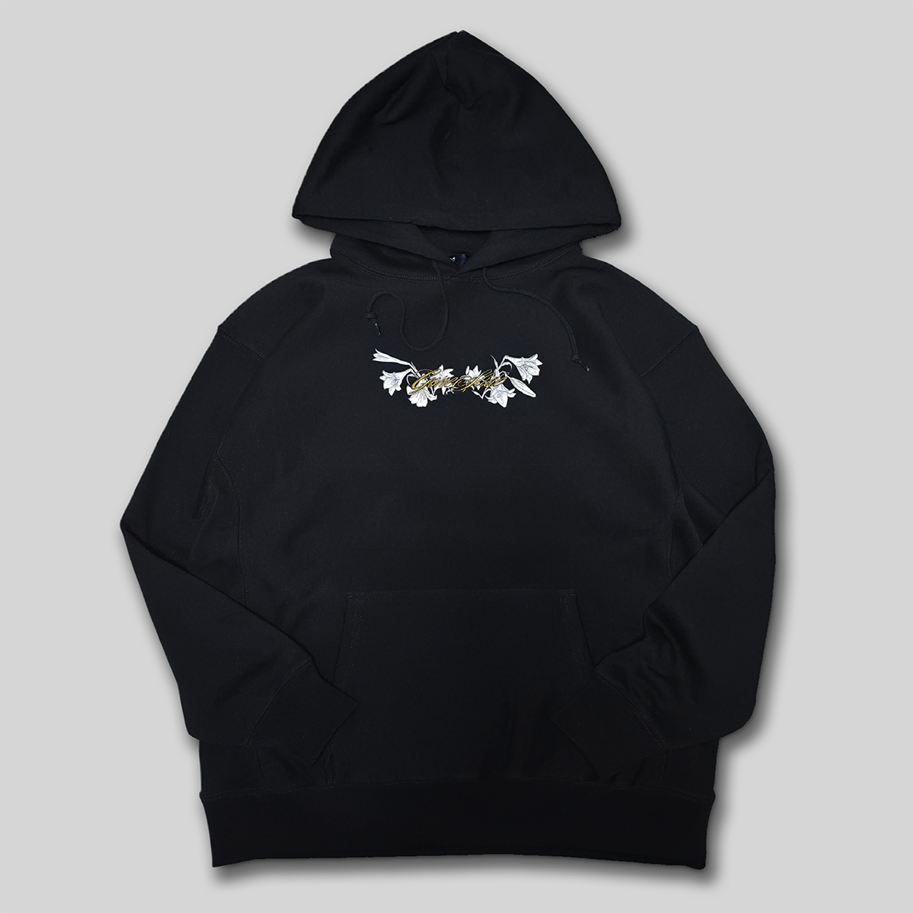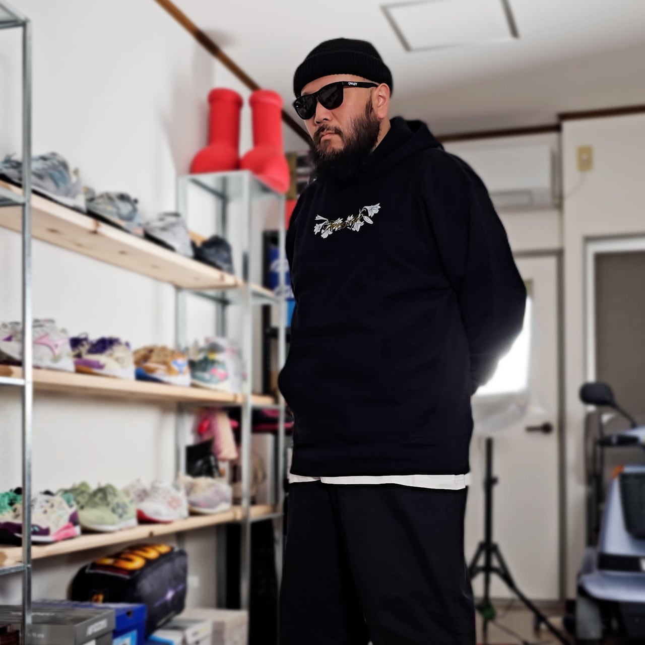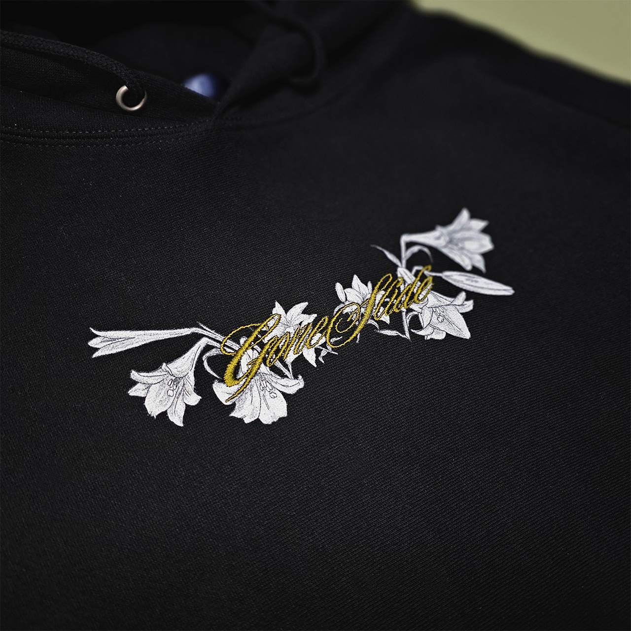 ・ボディの上にSneakers Trashのアイコンでもあるユリのプリントを行い、さらにその上からGONE SLIDEの刺繍を施しています。